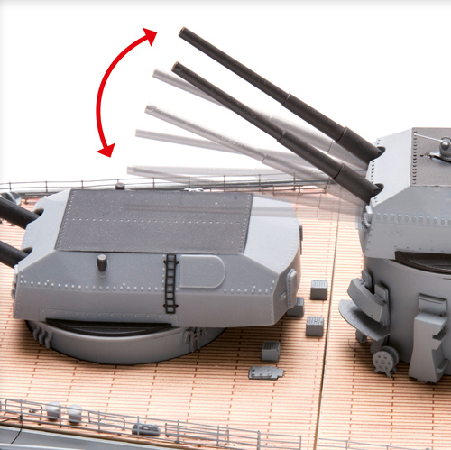 Pomocí infračerveného dálkového ovládání budete moci otáčet věžemi a děly, rozsvěcet palubní reflektory, přehrávat zvuky a lomoz. Kromě toho je trup modelu vyroben výhradně z kovu a jedna jeho odnímatelná část umožňuje pohled do turbínové strojovny vlevo.